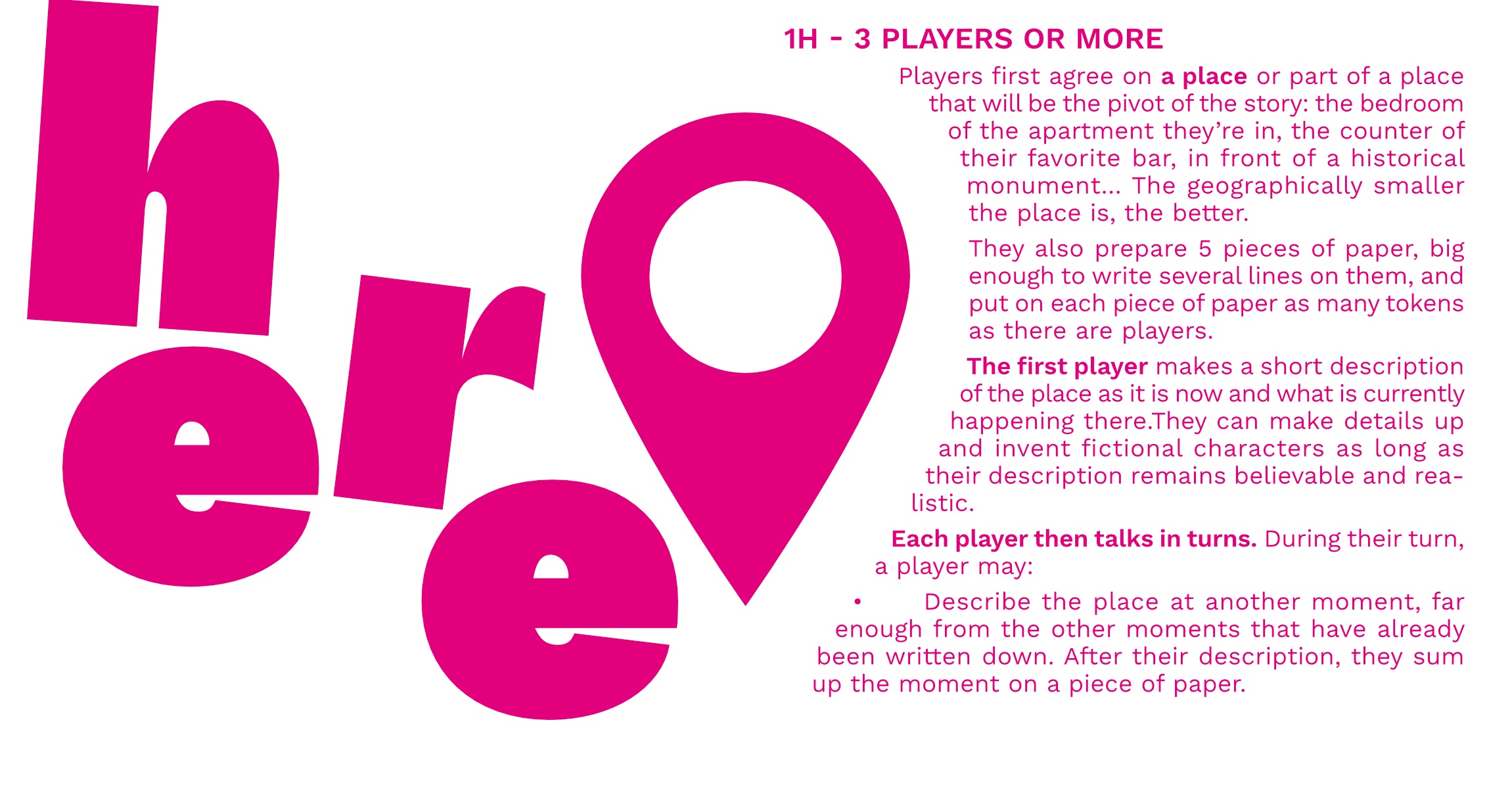 HERE & NOW is played with index cards which list the different moments and/or places players will wander through during the game, as well as tokens to make sure everyone has an equal place around the table.