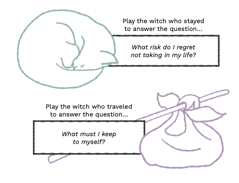 SHE TRAVELED, YOU STAYED / SHE STAYED, YOU TRAVELED is a 2-player game; it features tables to create the two witches about to meet which will help players recreate a real-time conversation of two estranged friends.