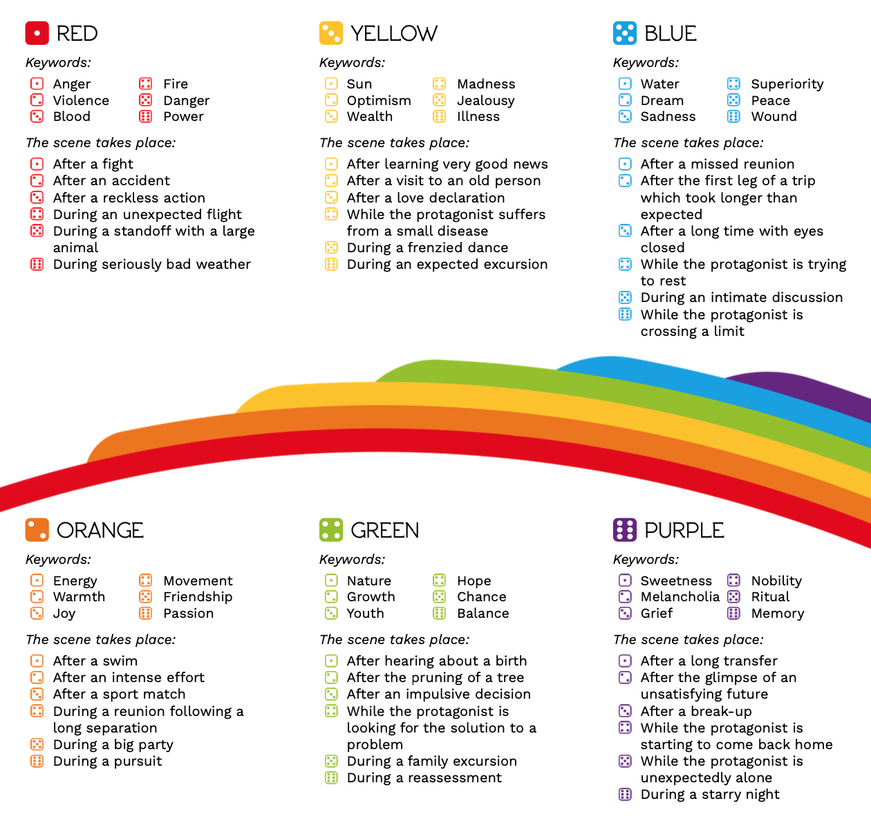 THE SEVENTH RAINBOW is mostly made of freeform narration: in each scene, players agree on a theme, divide the roles among themselves (the protagonist, secondary characters, the setting) and improvise what happens.