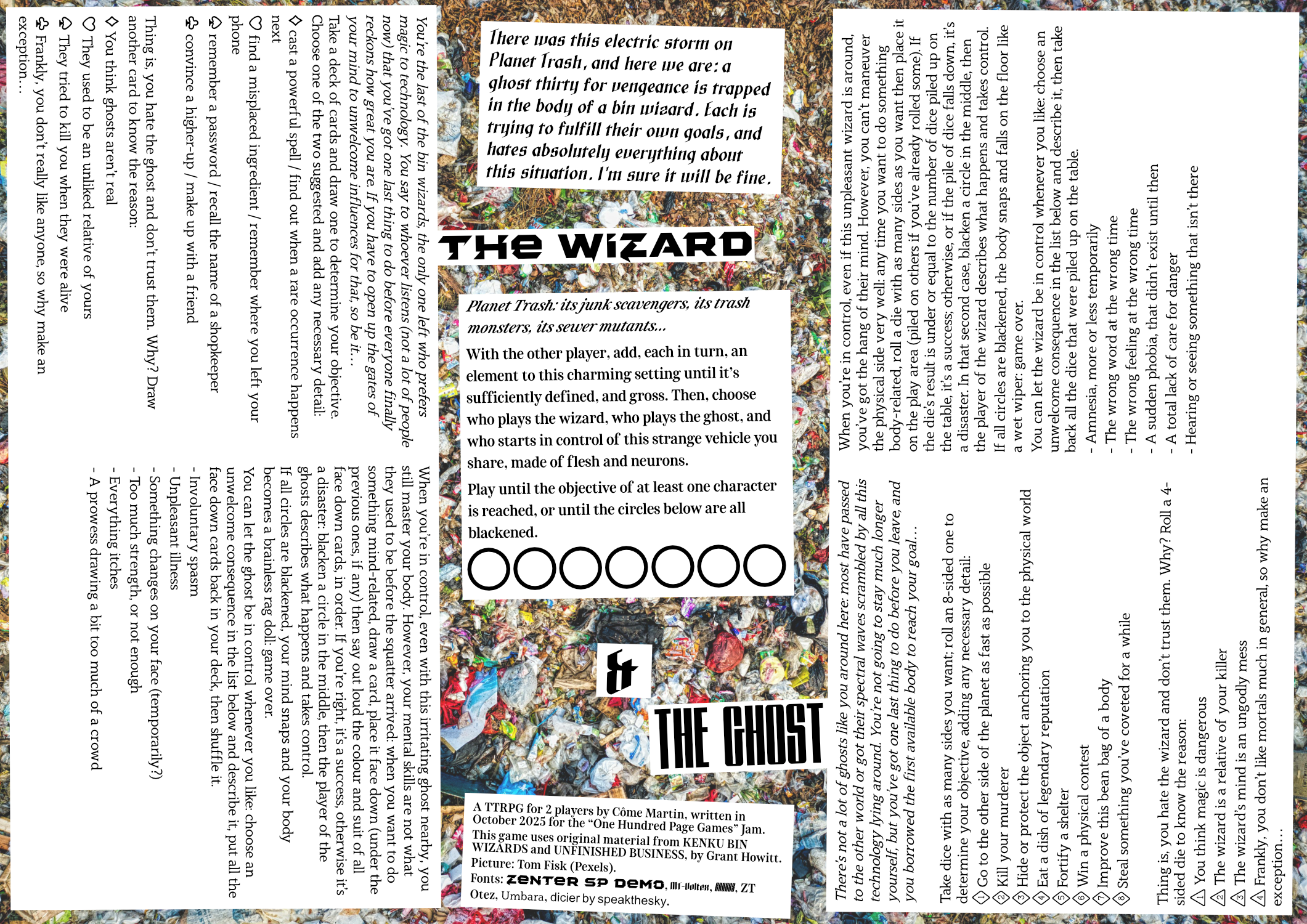 Un mélange/hack de KENKU BIN WIZARDS et UNFINISHED BUSINESS de Grant Howitt, pour 2 joueurs. Écrit pour la One Hunded Page Games Jam.